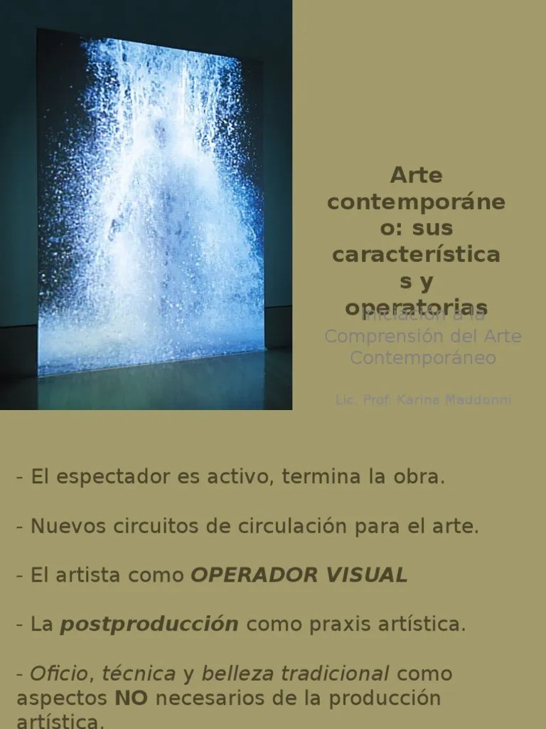 A arte visual no mundo contemporâneo1 nelcí andreatta kunzler2 resumo o mundo contemporâneo é multifacetado, complexo e polêmico.. Se considera que el arte contemporáneo tiene sus principales fundamentos en el impresionismo y postimpresionismo, también se caracteriza por tener bases en lo abstracto. Se denomina así a las manifestaciones artísticas que comenzaron a surgir a inicios del siglo xx y que continúan hoy en día mediante las distintas eclosiones de vanguardia. En las obras de arte contemporáneo se … 30.11.2018 · características del arte contemporáneo. Lo que querían conseguir era olvidarse de las antiguas características y para ello dejaron claro que las personas. A arte visual no mundo contemporâneo1 nelcí andreatta kunzler2 resumo o mundo contemporâneo é multifacetado, complexo e polêmico. 30 noviembre, 2018 por leire ¿qué es el arte contemporáneo?