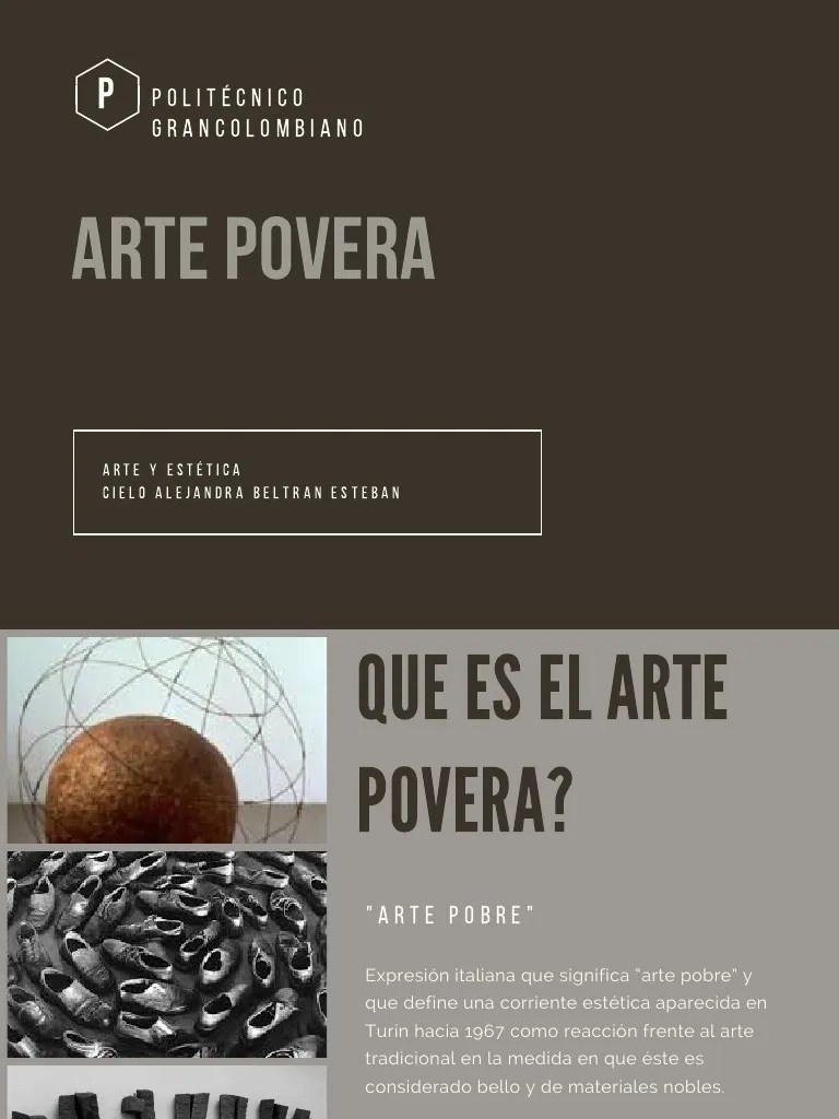 06/03/2021 · arte povera (arte pobre). El arte povera basa su estética en las relaciones entre el objeto y su configuración, valorando especialmente dos aspectos: Arte povera) es un movimiento artístico surgido en italia en la segunda mitad de la década de 1960, al cual se adhirieron autores del ámbito predominantemente turinés. El arte povera se formó esencialmente en torno a dos núcleos:
