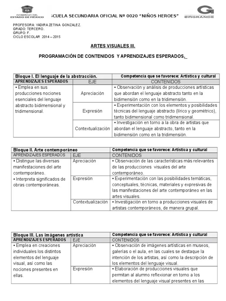 Indaga algunos trabajos colectivos de artes visuales y plásticos, para reconocer la importancia del arte colectivo en la sociedad actual, y aprecia sus cualidades estéticas. • analiza funciones sociales de la imagen, empleando sus recursos visuales y comunicativos en producciones propias. Contenidos • emplea en sus producciones. Programa de artes visuales para secundaria domingo, 22 de enero de 2012. Artes visuales aprendizaje esperado actividades primer grado observa y compara piezas artísticas de lugares, técnicas y épocas diversas, para proponer en colectivo el tema para la exposición artística... Nociones esenciales del lenguaje abstracto bidimensional y tridimensional.